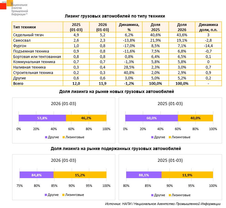 По данным маркетингового агентства НАПИ, за январь-март 2026 года в финансовый лизинг корпоративным клиентам было выдано 11,9 тыс. ед. новых и подержанных грузовых автомобилей*, что на 1,2% меньше, чем за аналогичный период 2025 года.