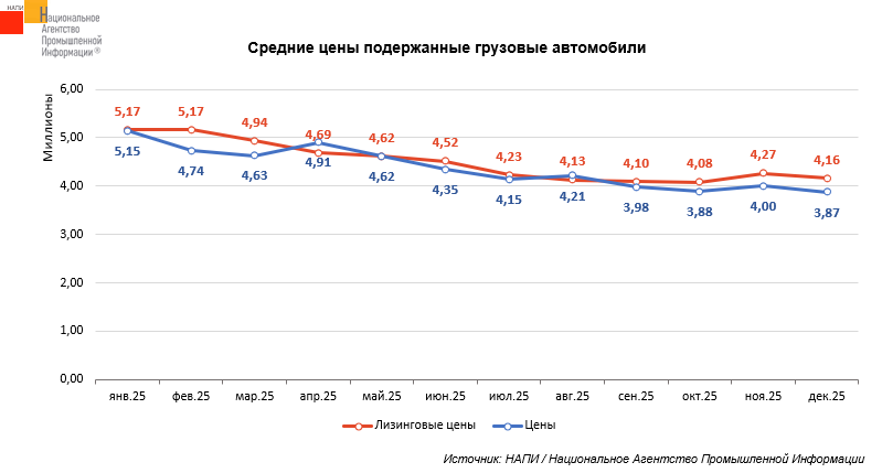 В декабре 2025 года по сравнению с январем того же года средние цены на подержанные грузовики сократились на 24,7%, а лизинговые цены снизились на 19,4%.