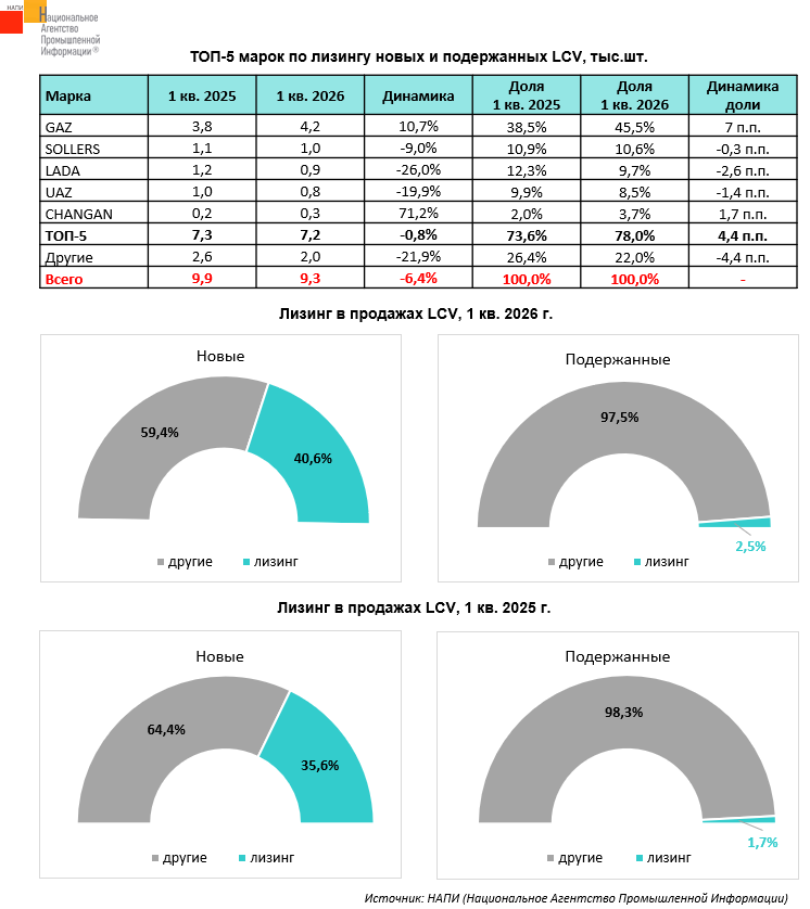 ТОП-5 марок LCV по выдаче в лизинг в первом квартале 2026 года возглавил GAZ, его доля за год выросла на 7 п.п. и достигла 45,5% от общего лизинга LCV. На втором и третьем месте расположились SOLLERS и LADA, чьи доли сократились до 10,6% и 9,7% соответственно. Закрыли топ марки UAZ с долей 8,5% и CHANGAN с долей 3,7%. Стоит отметить, что на пятерку лидеров приходится 78,0% от всей выдачи в лизинг, за год доля ТОП-5 марок прибавила 4,4 п.п.