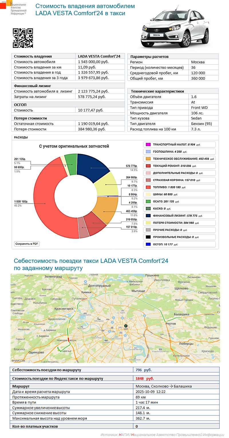 Маркетинговое агентство НАПИ проанализировало стоимость владения автомобилем марки LADA VESTA Comfort’24 с использованием онлайн калькулятора стоимости владения DV – TCO.